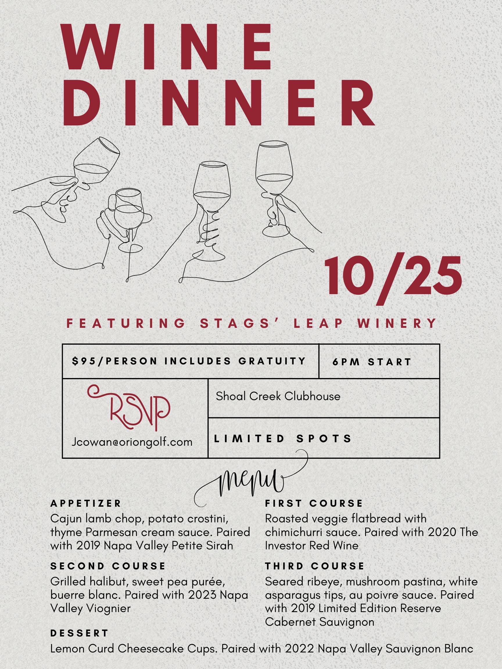 Join us for a wine dinner featuring Stags' Leap Winery! 6 PM Start. $95/Person includes gratuity. View attachment for more information & full pairing menu. Email JCowan@oriongolf.com to register!